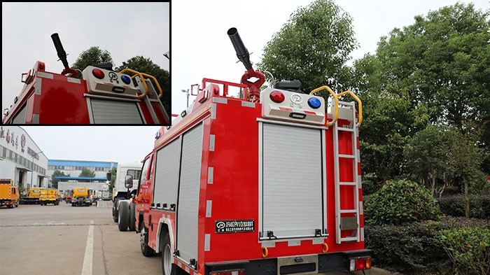 在箱體尾部上方還有兩個(gè)紅藍(lán)兩色的爆閃燈,它們的作用是讓出警時(shí)的消防車更加醒目,同時(shí)提醒行人和車輛及時(shí)避讓。箱體尾門卷閘門旁邊還有一架折疊梯子,它的作用是方便消防員到車頂取用或操作消防設(shè)備,設(shè)計(jì)很周到。這個(gè)小細(xì)節(jié)也很重要,在尾門下面可以看到兩個(gè)黃色的圓環(huán),它們的作用是能夠讓這臺(tái)泡沫消防車在必要時(shí)牽引車輛或清理障礙。